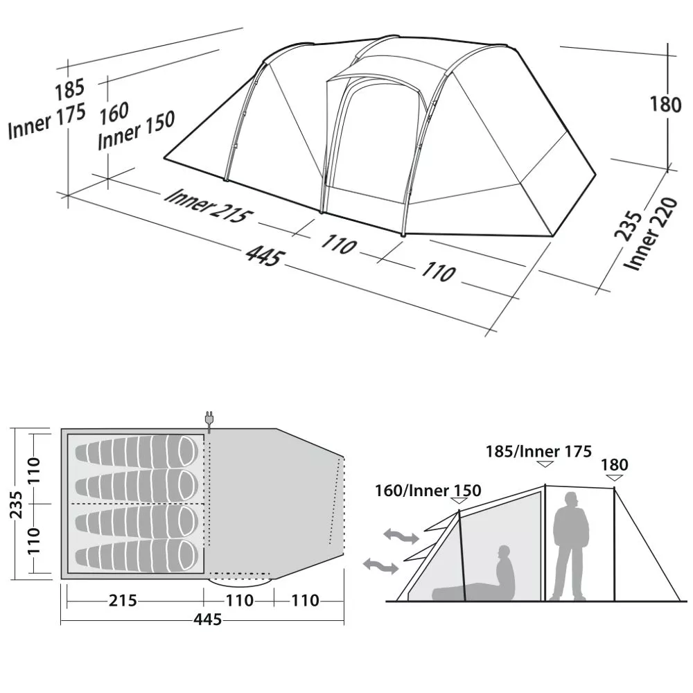 235 x 445 x 160/185 cm (BxTxH)