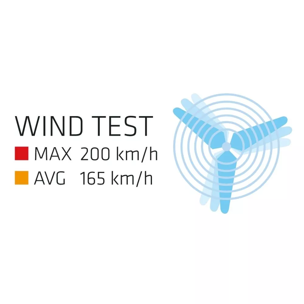 durchschnittliche Windgeschwindigkeit, bei der es zu Instabilitäten in der Zeltstruktur kommt: 165 km/h