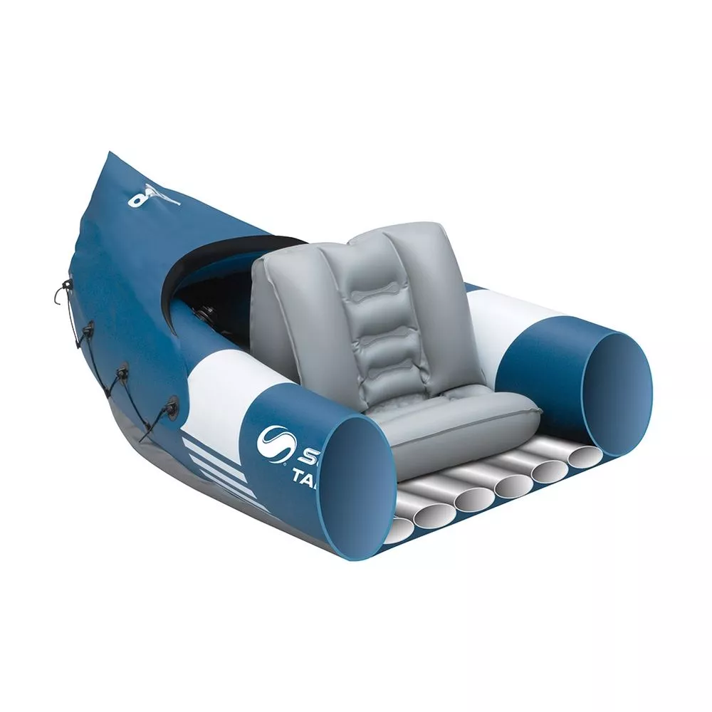Das klassisch zeitlose Kajak Sevylor Tahaa Kit lädt zu Ausflügen und Freizeitabenteuern auf dem Wasser ein. Mit der leichten und robusten Konstruktion eignet sich das aufblasbare Kajak auch hervorragend für Einsteiger. Kompakt und mit einem Gewicht von unter 8 kg lässt sich das Schlauchkajak mit geringem Packmass leicht verstauen und transportieren. Aus strapazierfähigem PVC gefertigt, ist es resistent gegen Sonne, Öl und Meerwasser. Für zusätzlichen Komfort zeigt Sevytest deutlich an, wann das Kajak den richtigen Druck erreicht hat.