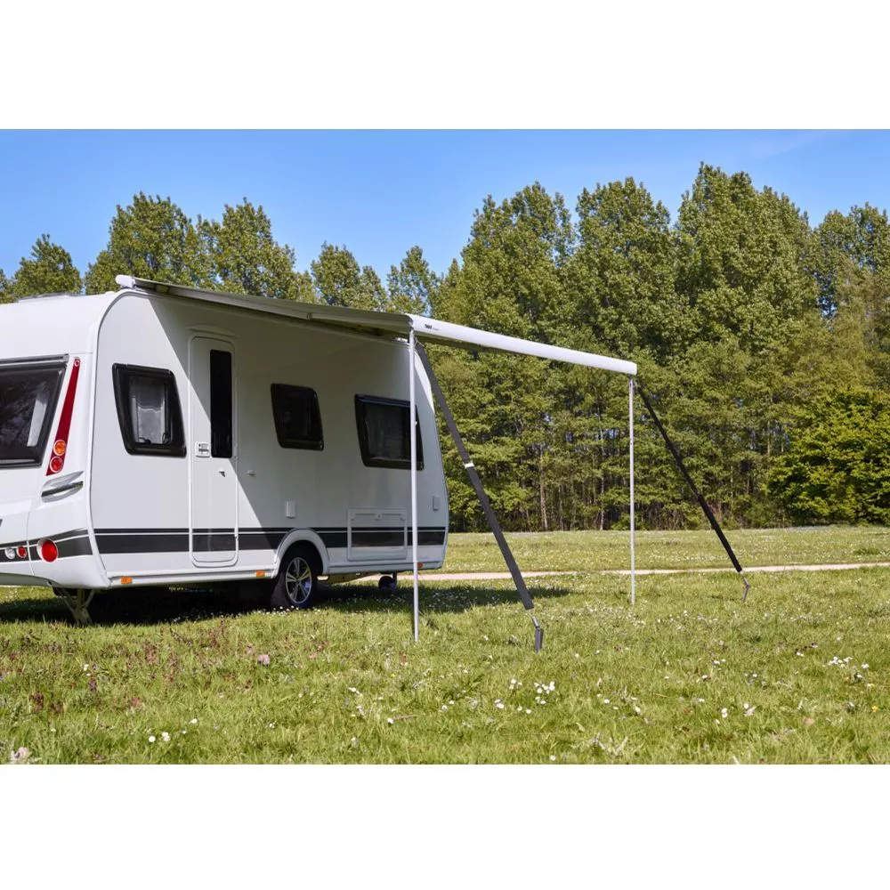 auch beim Thule Omnistor Caravan Style und Thule Omnistor 2000 einsetzbar - die Abspanngurte werden an den oberen Scharnierpunkten der Stützfüsse eingehängt und seitlich nach vorne abgespannt