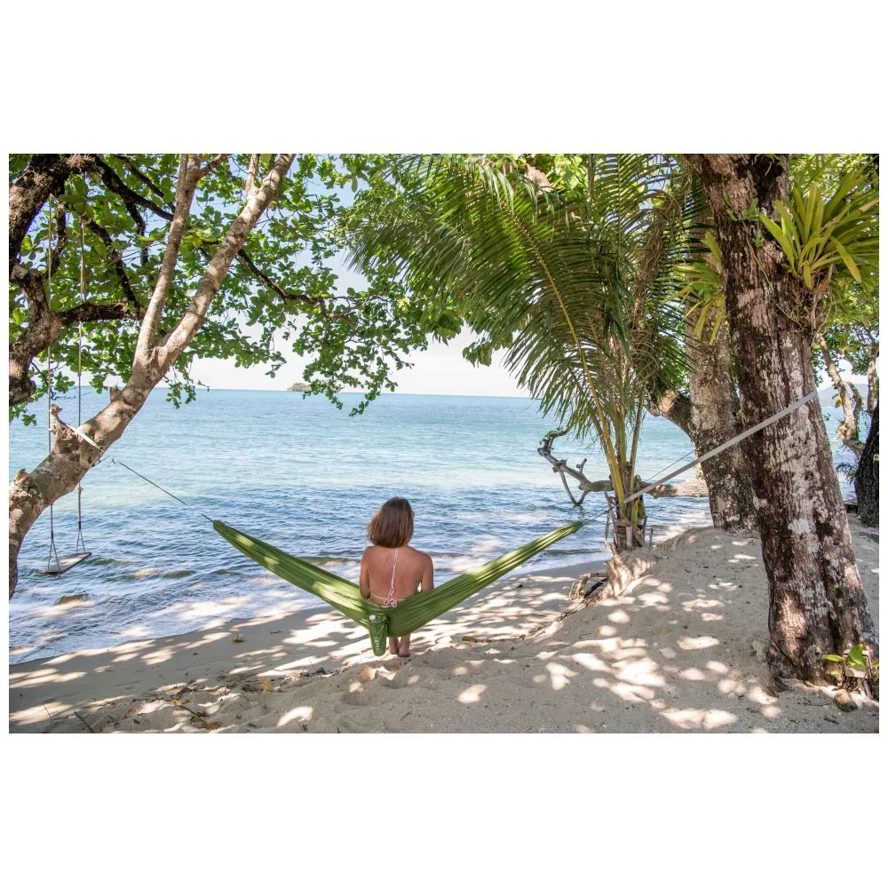 Das Exped Travel Hammock Kit ist eine leichte, kompakte und komplette Immer-Dabei-Reisehängematte zum Verweilen, die Seele baumeln lassen und die Natur geniessen. Superschnelles Auf- und Abhängen der Hängematte mittels raffinierter Aufhänge-Schlitz-Seile und Strap-Lock-Sicherung des baumschonenden Gewebebandes. Die robusten 4-fach Nähte an den Hängematten-Enden sorgen für viel Stabilität. Zudem kannst du die Hängematte auch als Strandtuch oder Sonnendach verwenden. Der integrierte Packsack dient gleichzeitig als Tasche für Wasserflasche, Brille, Taschenbuch oder für den Ebook-Reader.