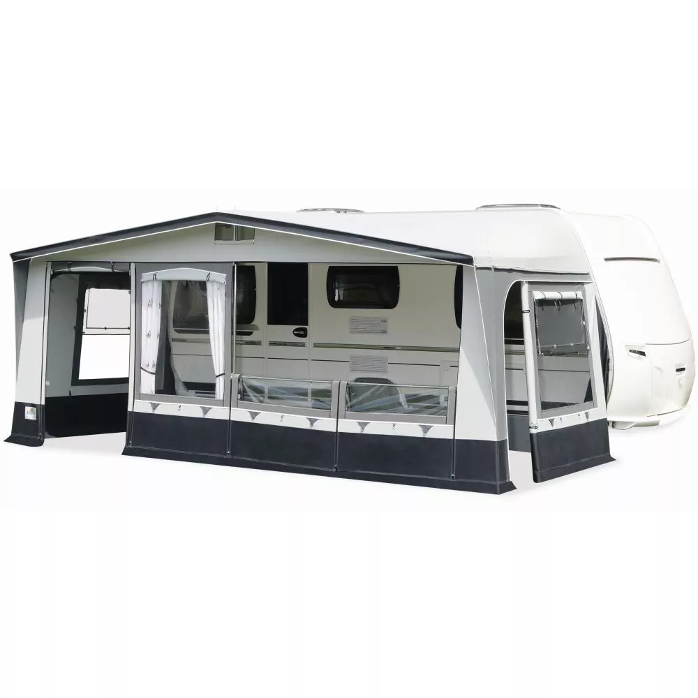 In der Gestaltung bist du sehr flexibel: Durch die Element-Technik der Front, kannst du die Türposition frei wählen. Der beliebte Veranda-Effekt ist mit zusätzlichen Balkonstangen ebenfalls möglich. Benötigst du nur ein luftiges, Schatten spendendes Wohnwagen-Sonnendach, entfernst du einfach alle Front- und Seitenwand-Elemente.