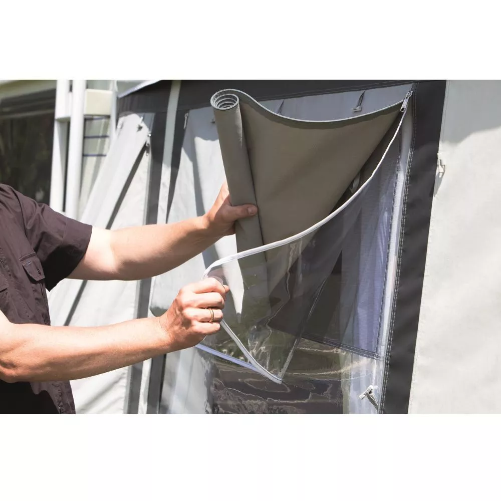 ist ein Ausgleichselement um die leicht schräg gestellte Vorzelt-Seitenwand an einen aerodynamischen Bugverlauf am Fahrzeug ausgleichen zu können. Sie steigert die Passform des Zeltes. Damit behält die rechte Seitenwand des Zeltes ihre konstruktiv vorgegebene Neigung, die für einen Erkeranbau notwendig ist. Die doppelte Windecke und die Seitenwand verfügen über einen separaten Einzugskeder, so dass wahlweise beim Zeltaufbau entschieden werden kann. - Robuste Reissverschlüsse: